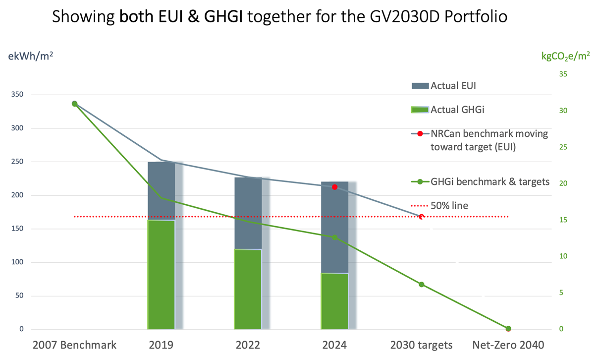 35% lower EUI compared to 2007 benchmark; 21 buildings have already achieved the target of 50% by 2030